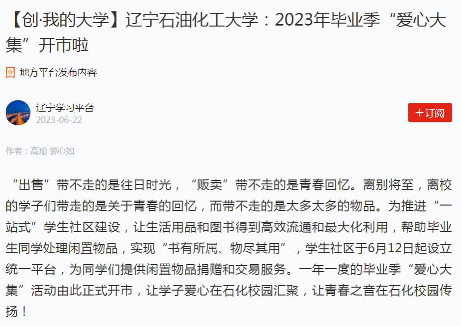 编者按:近日,学习强国辽宁学习平台、辽宁日报·北国号、人民日报客户端·人民号等媒体平台对我校学生社区于6月12日起设立统一平台,为同学们提供闲置物品捐赠和交易服务,“爱心大集”活动由此正式开市,让学子爱心在石化校园汇聚,让青春之音在石化校园传扬进行了宣传报道。现将相关报道转载如下:
