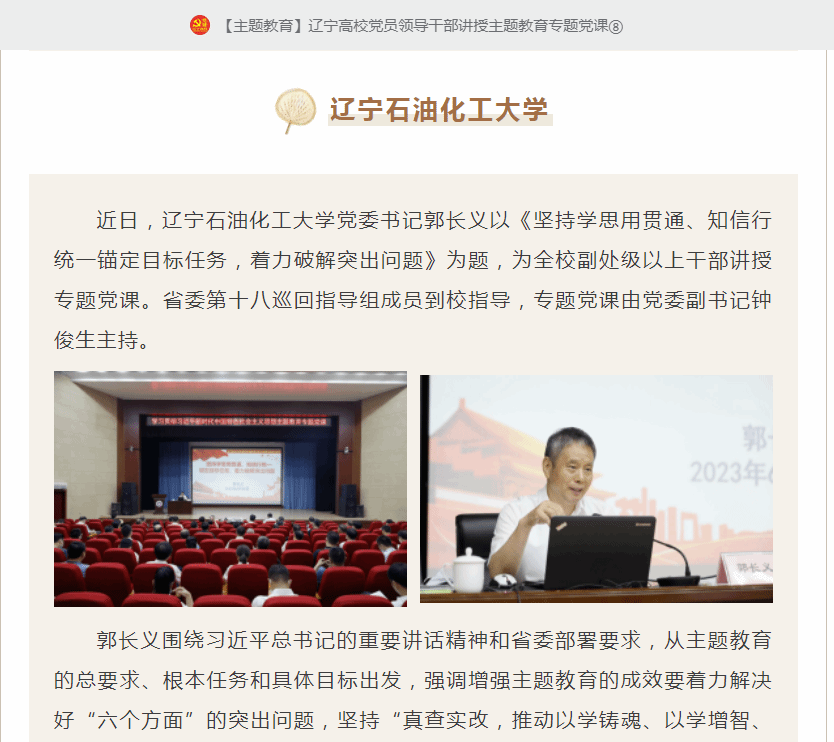 编者按:近日,辽宁高校党建微信公众号对辽宁高校党员领导干部充分发挥示范带动学的作用,结合学习党的创新理论的思考体会和实际工作,为师生党员讲授专题党课进行了宣传,其中对我校党委书记郭长义以《坚持学思用贯通、知信行统一 锚定目标任务,着力破解突出问题》为题,为全校副处级以上干部讲授专题党课作了报道。现将相关报道转载如下:
