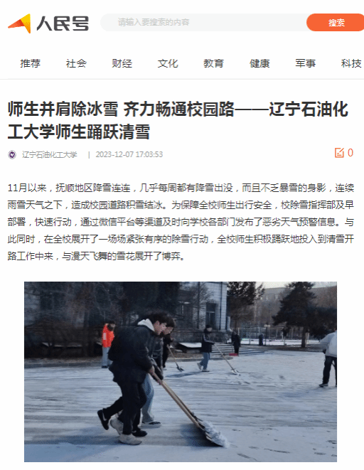 编者按:11月以来,抚顺地区降雪连连,几乎每周都有降雪出没,而且不乏暴雪的身影,连续雨雪天气之下,造成校园道路积雪结冰。为保障全校师生出行安全,校除雪指挥部及早部署,快速行动,通过微信平台等渠道及时向学校各部门发布了恶劣天气预警信息。与此同时,在全校展开了一场场紧张有序的除雪行动,全校师生积极踊跃地投入到清雪开路工作中来,与漫天飞舞的雪花展开了博弈。中国大学生网、辽宁日报·辽望号、人民日报客户端·人民号对此进行了宣传报道。现将相关报道转载如下: