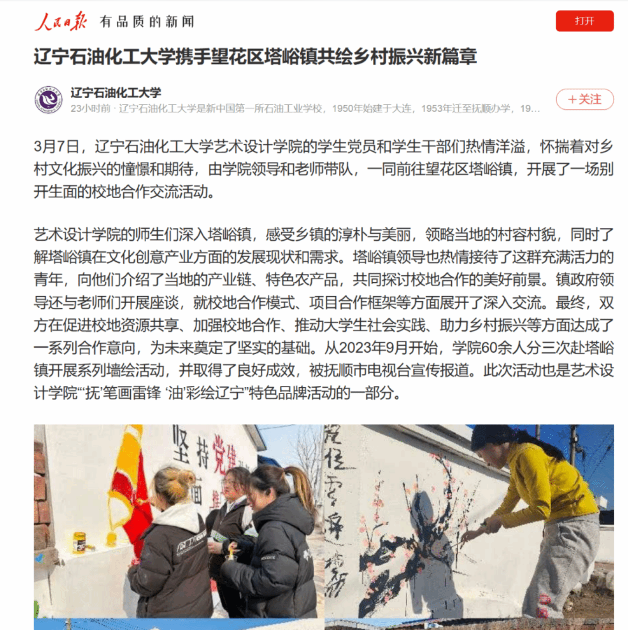 编者按:近日,东北新闻网、人民日报客户端·人民号、辽宁日报·辽望号对我校艺术设计学院师生赴望花区塔峪镇,开展校地合作交流活动进行了宣传报道。现将相关报道转载如下: