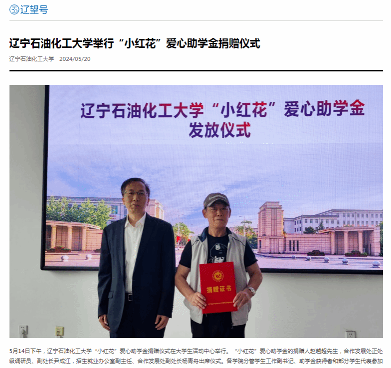 编者按:近日,中国大学生网、人民日报客户端·人民号、辽宁日报·辽望号、搜狐号对我校“小红花”爱心助学金捐赠仪式在大学生活动中心举行进行了宣传报道。现将相关报道转载如下: